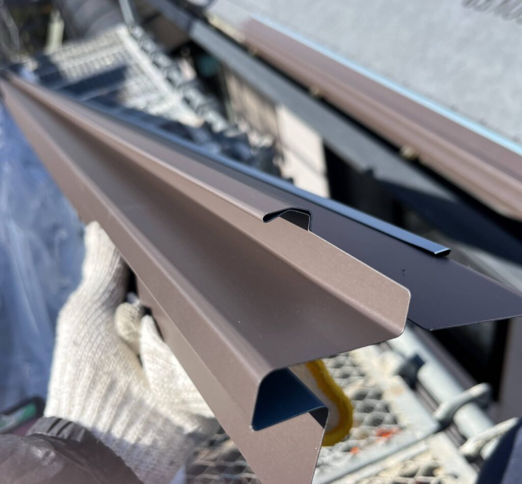 外壁と屋根が取り合う部分に取り付ける板金です。壁際からの雨水侵入を防ぐストッパーの役割を果たします。ここは隙間が生じやすく、コーキングだけでは耐久性が不十分なため、板金でしっかりと押さえることが重要です。