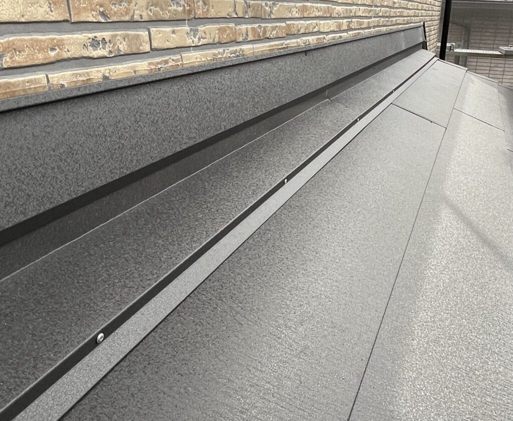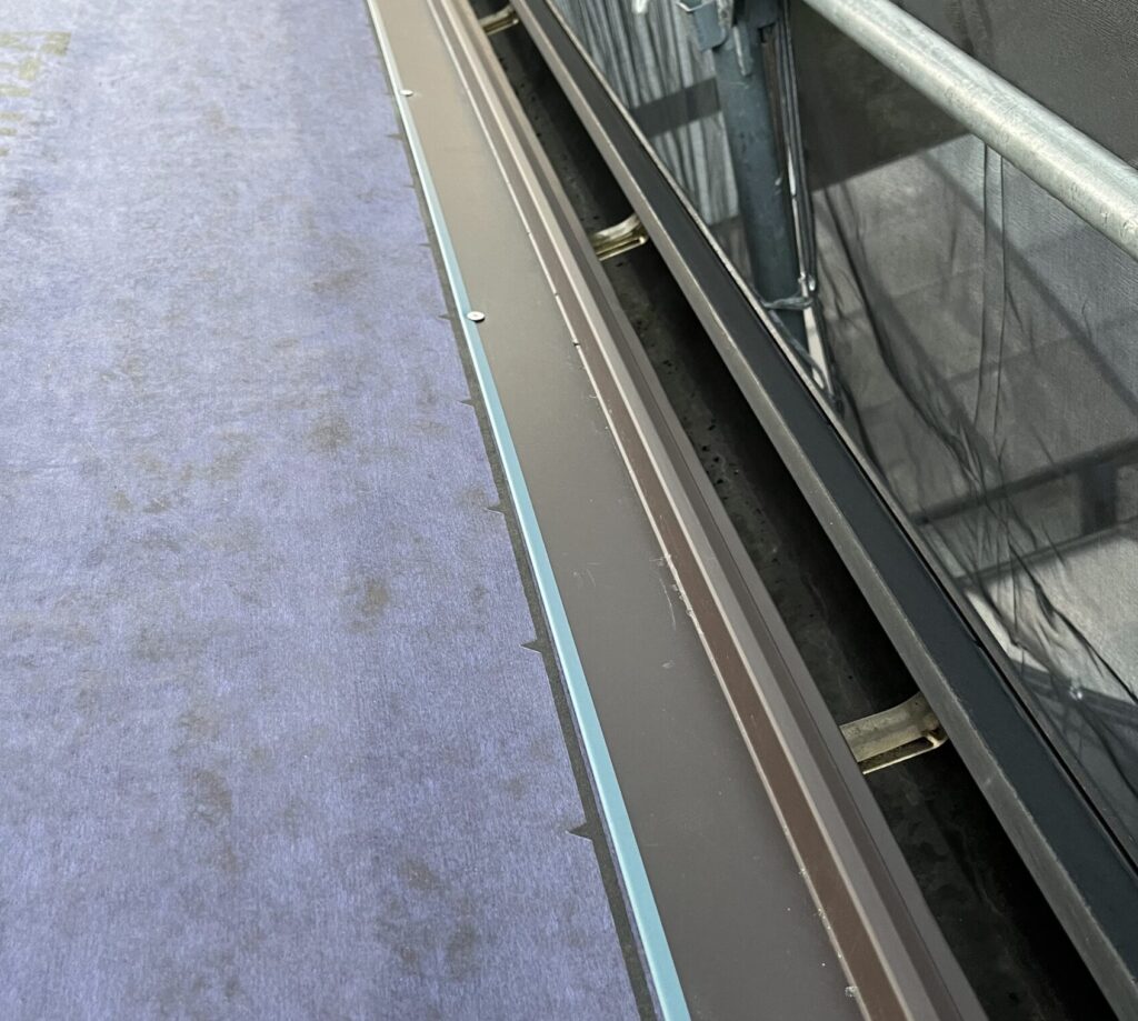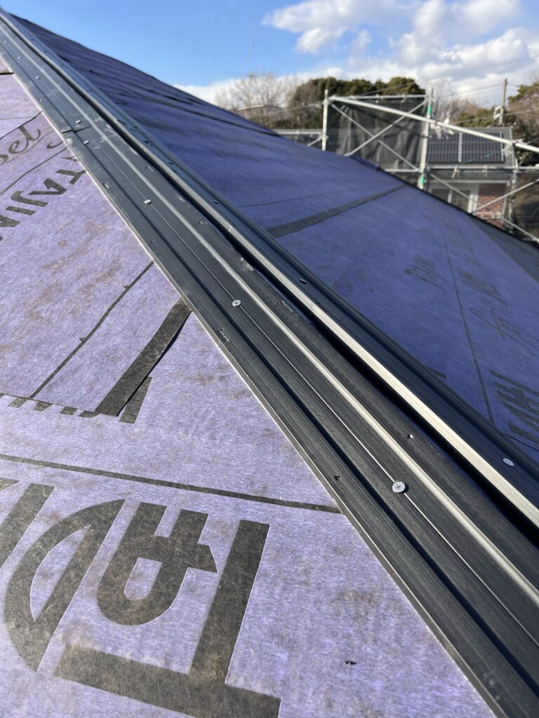 この屋根工事の工程では、改質アスファルトルーフィング以上のグレードのものを全面に敷設します。
