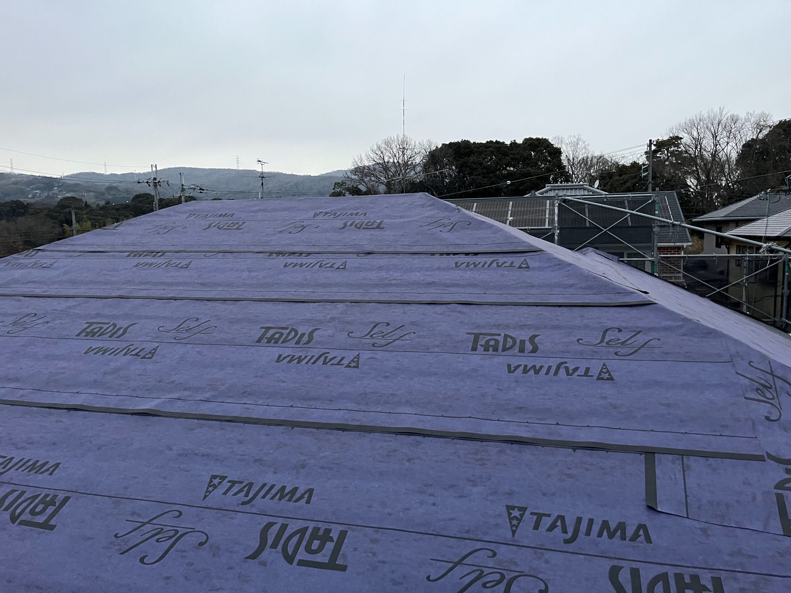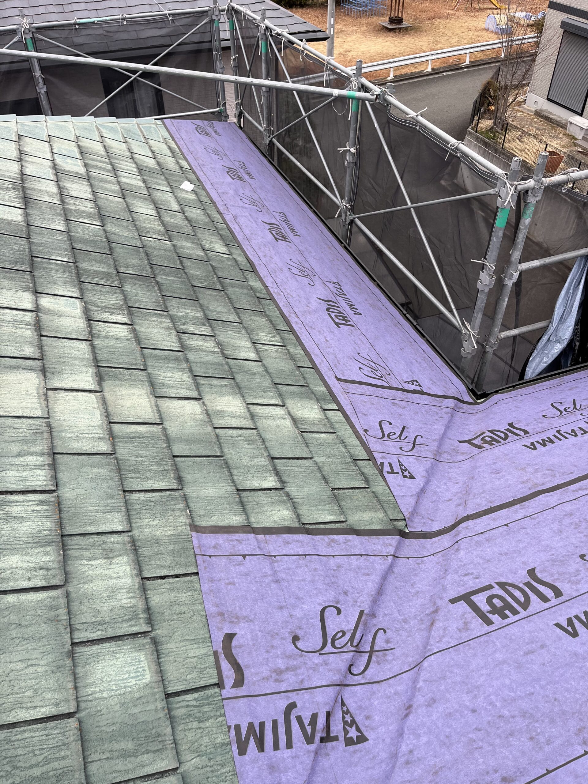- 既存スレート屋根の上に防水シート(ルーフィング)を張り、雨水の侵入をブロック